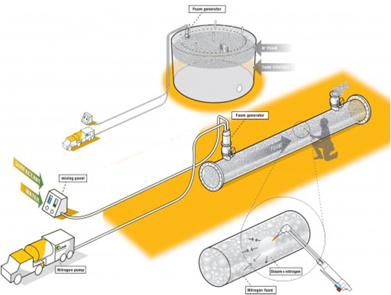 Nitrogen foam is stable, visible and biodegradable. During deployment, which operating procedure would have been determined in details by our specialist, the level and density of foam are controlled by a mixing panel to ensure sufficient production. Upon completion of the hot work, the foam disintegrates into water, surfactant and gaseous nitrogen which can be drained from the process item and dried if required.